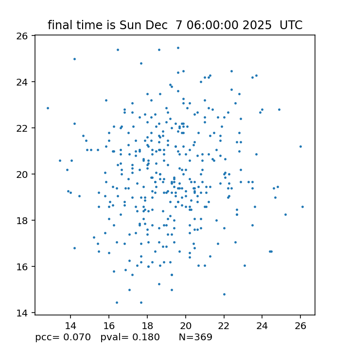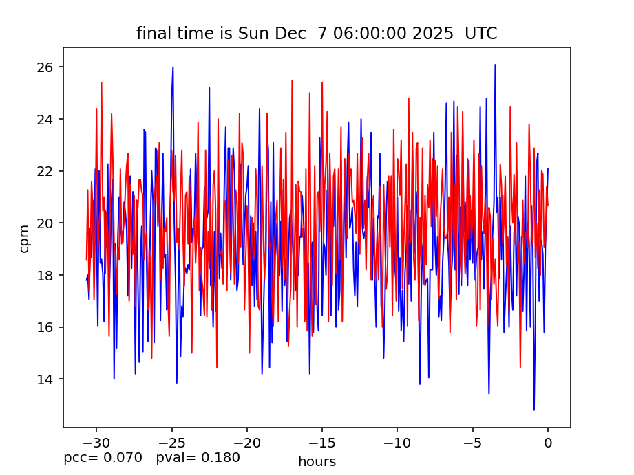 | Here are the counts per minute from two of my $20 Geiger counter kits, connected to a Raspberry Pi Zero W. The Geiger counters are in my home, about 10 m apart. They are detecting background radiation, mostly gamma rays. A cpm measurement is uploaded every 5 minutes, from the counts of the previous 5 minutes. The plot is regenerated every hour. Normal background radiation is about 16 cpm. If you see a spike of about 70 cpm, it is due to a small sample of uranium being placed near the Geiger counter. Or a power failure and reboot. I calculate the Pearson correlation coefficient and the p-value for fun. More about that later, if some significant correlation occurs... |